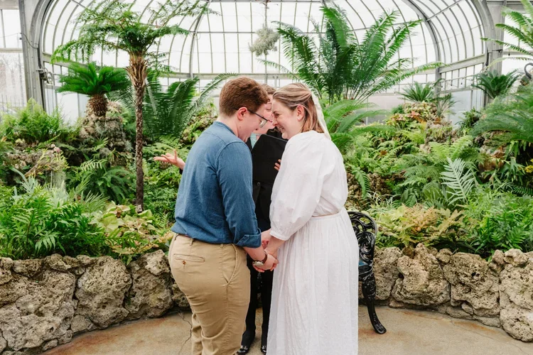 Kim and Micah’s intimate LGBTQ+ elopement at the Anna Scripps Whitcomb Conservatory on Detroit’s Belle Isle was a powerful reminder of both love’s resilience and the bittersweet urgency many queer couples still face today.