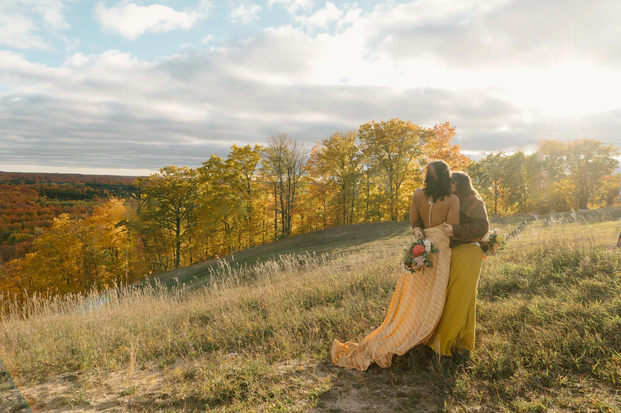 It was as if all of the leaves suddenly decided, simultaneously, to turn the most STUNNINGLY BRIGHT colors just for their wedding. It doesn’t get much better than a queer fall wedding in Northern Michigan!! Bring me back to this day please!!